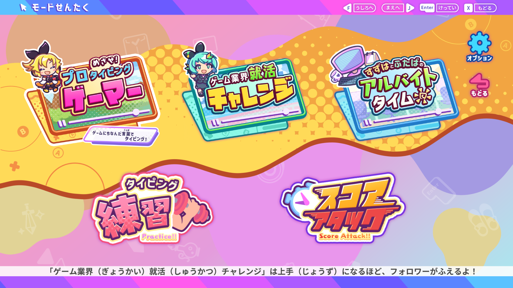 「めざせ!プロタイピングゲーマー」、「ゲーム業界就活チャレンジ」の2つのモードでは姉の「涼葉(すずは)」は超人気配信者を、妹の「双葉(ふたば)」はカリスマ就活生(いつか就職するはず?)をそれぞれ目指すべく、皆さんと一緒にタイピング力を鍛えていきます。
