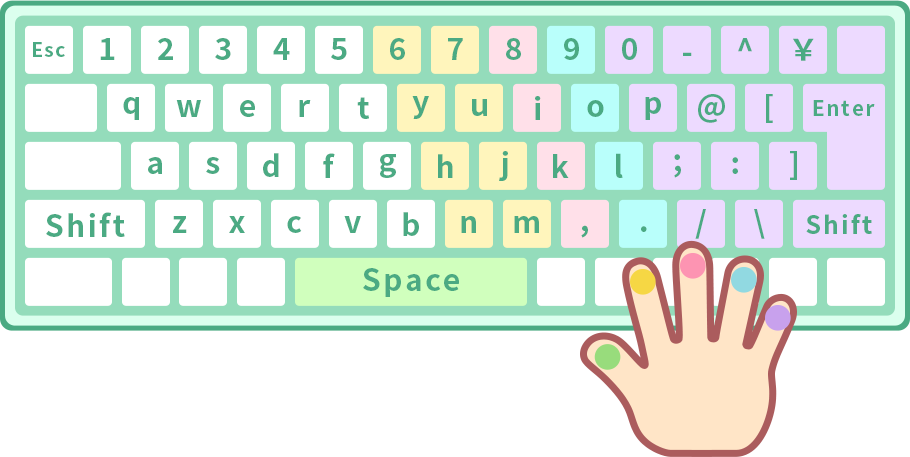 Fキーに左手人差し指、Jキーに右手人差し指がタイピングの基本的なホームポジションです。