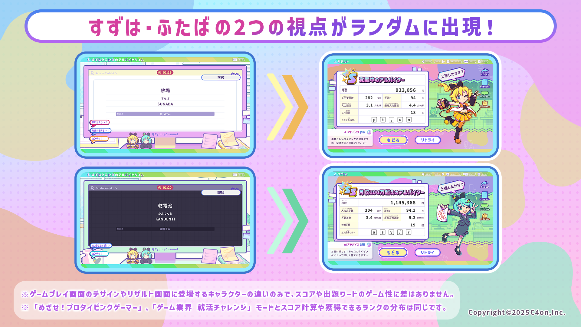 ※2つの視点は、ゲームプレイ画面のデザインやリザルト画面に登場するキャラクターの違いのみで、スコアや出題ワード等のゲーム性に差はありません。