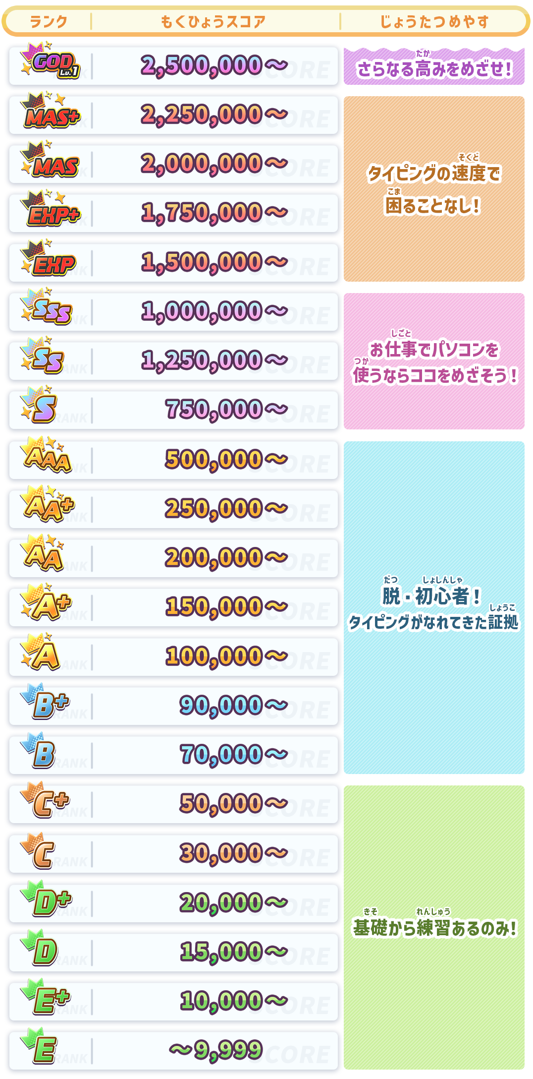 ランクには「E」から「GOD」までがあります。初心者を脱する目安は「A~B」ランク、お仕事などでパソコンを使うなら「S」ランクが目安となります。